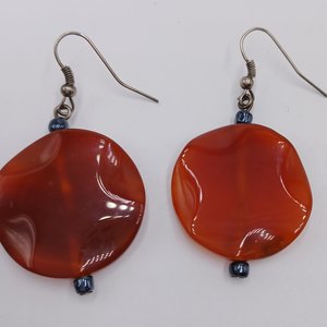 Gorgeous shiny polished carnelian stones. They are a round with beveled/wavy edge. The light shines through them showing all of the perfectly imperfect inclusions and naturalness. They are for pierced ears and have ear wires. They are a deep dark orange.